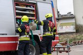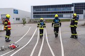 Dabei stand die Aufgabenverteilung innerhalb der Gruppe bei verschiedenen Löschangriffen im Fokus. Begonnen wurde am Gelände der Fa. Promot, wo das Herstellen einer Saugleitung, das Verlegen von Zubringerleitungen in verschiedenen Längen und verschiedene Löschangriffe bis hin zum Schaumangriff wiederholt wurden.